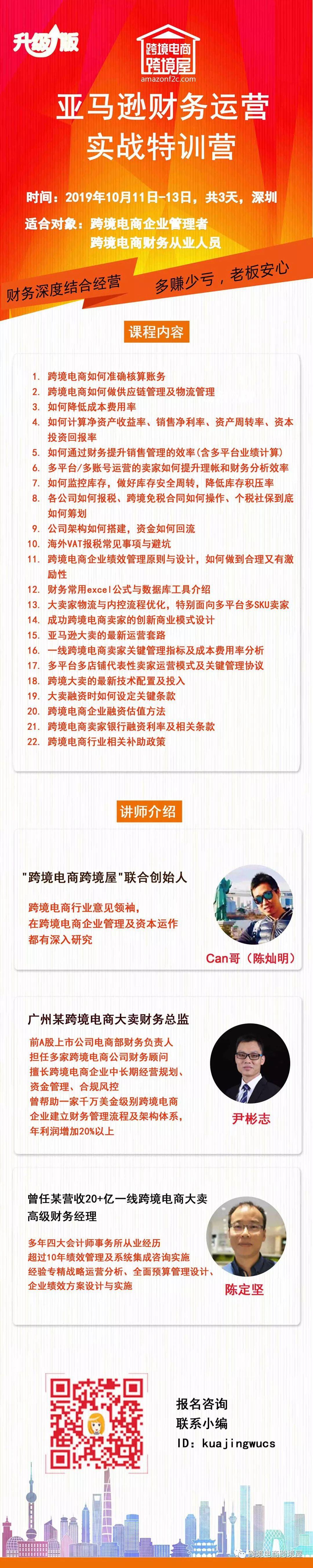 学习跨境电商行业内领先的经营财务管理能力,通过财务和系统提升公司的盈利能力,降低风险,快来参加跨境电商业内标杆的财务及管理课程:跨境屋亚马逊经营财务特训营。