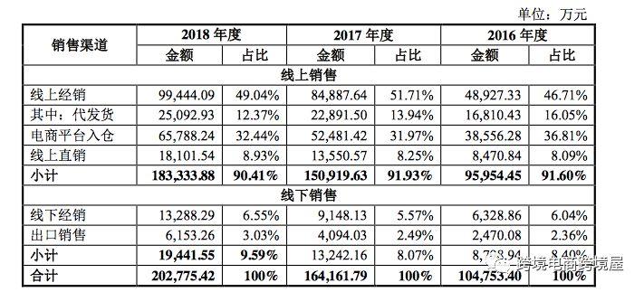 其中,2016-2018年,公司线上销售收入分别为95,954.45万元、 150,919.63万元和183,333.88万元,占主营业务收入的比例分别为 91.60%、 91.93%和 90.41%,是绝对最大的销售渠道。