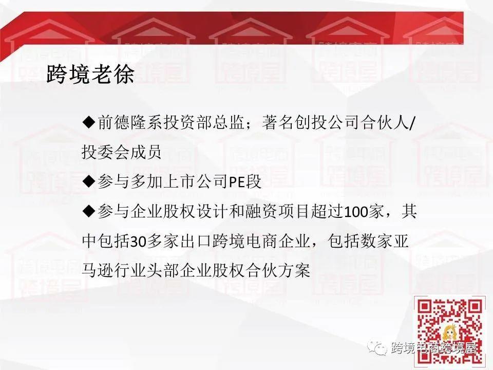 跨境老徐是金融行业出身,有金融和跨境电商跨行业经验和大量企业股权设计实操案例,把跨境电商行业的顶层设计用最浅显的语言表达出来,让众多企业可以将看似复杂的规则快速应用的企业中。