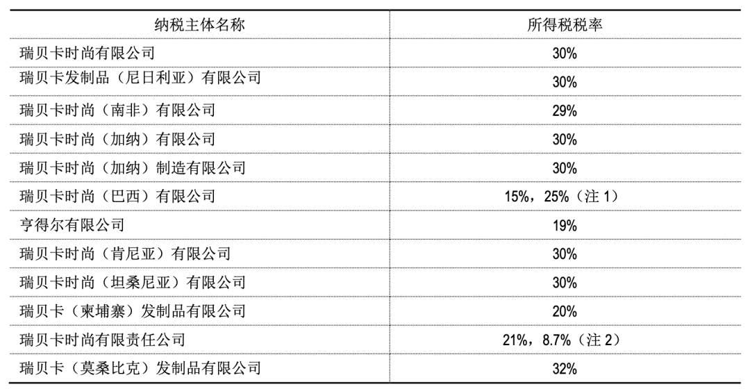 在不同国家,所得税税率各不一样。瑞贝卡时尚有限责任公司注册地美国特拉华州,缴纳联邦公司所得税,税率为21%,同时根据公司注册地特拉华州的税收法规的规定缴纳州公司所得税,税率为8.7%,在计算联邦公司所得税时,州公司所得税可以抵减。而瑞贝卡时尚(巴西)有限公司依照注册地巴西圣保罗有关税收法规的规定,企业所得税经调整后之应税所得总额在24万雷亚尔以下时,税率为15%,超过24万雷亚尔以上部份, 另征附加税10%。